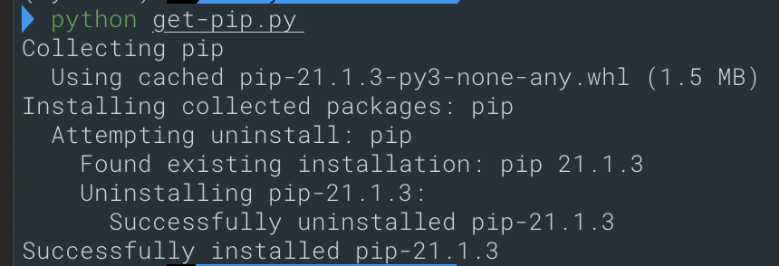 pip를 새로 설치하고 나며, 문제가 되는 pip 21.1.x 버전으로 설치가 되게 된다.
