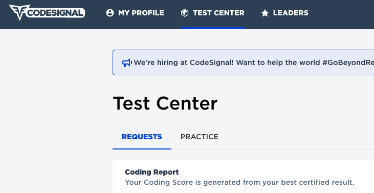 실제 기업 인터뷰 및 코딩테스트이 실시되는 "Test Center"를 제공하며, 여기에는 연습 테스트를 진행해 볼 수 있다. 1시간 10분의 시간이 주어진다. 시간은 아마도 테스트마다 변경이 될 수 있을 것이나, 기본은 1시간 10분으로 세팅되어 있다.