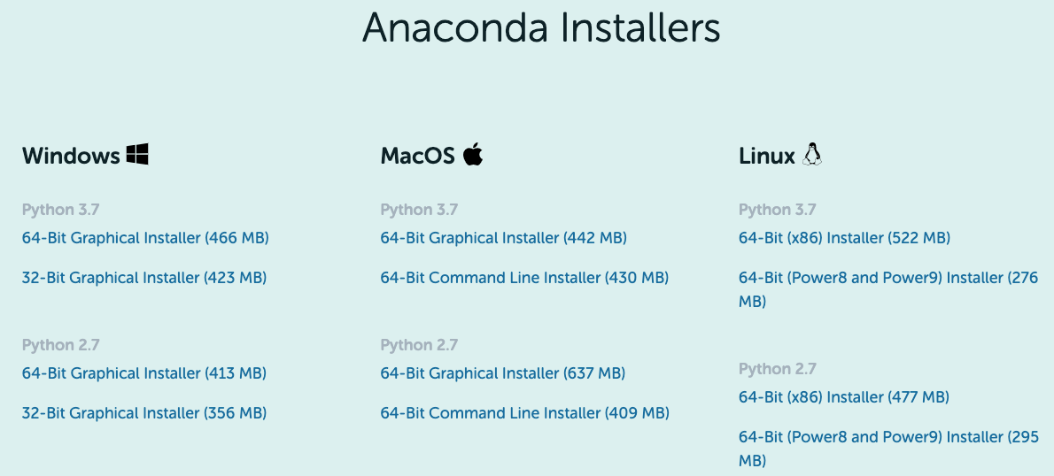 윈도우즈, 맥 OS, 리눅스 각 운영체제에 맞게 다운로드하여 설치하면 된다. 예전에는 python 3의 호환성이 낮아서 대부분 Python 2.7을 설치했으나, 요즈음 tensorflow 등 다양한 라이브러리들이 python 3을 기반으로 하고 있기 때문에 Python 3.7 설치를 권고한다. (뭐 그러나, 어차피 virtual Envs 사용할 거라면 크게 상관없다.)