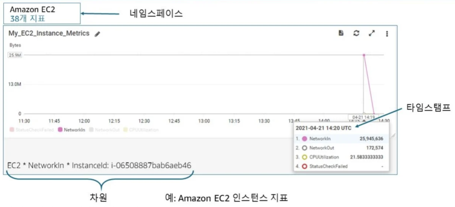 Amazon CloutWatch. 네임스페이스(자원 태그), EC2 지표 38개 지표 중 관심 지표만 선택 (차원) , 대시보드의 예 (우)