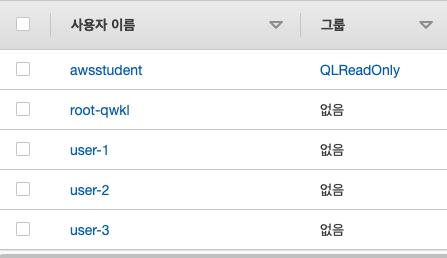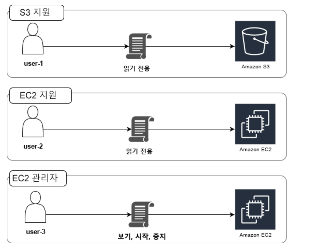 실습의 목적은 User-1 : S3만 ReadOnly, User-2: EC2 ReadOnly, User-3 : Admin/Read/Start/Stop 권한으로 각각 독립적으로 설정하는 것이 목표임