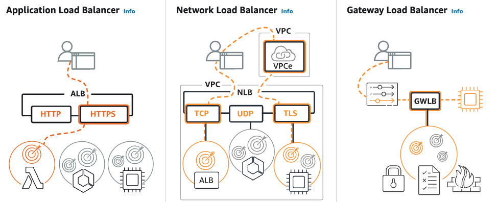 Application Load Balancer (L7) 부하 분산으로 지원하는 기능 (좌), Network Load Balancer 부하분산 지원 기능 (우)로드 밸런서의 종류별 차이에 대한 도식화