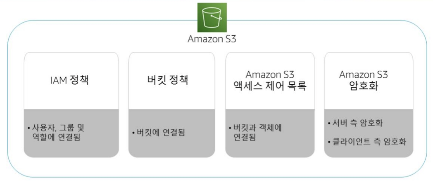 IAM 정책, 버킷 정책, ACL, 암호화 기능을 지원