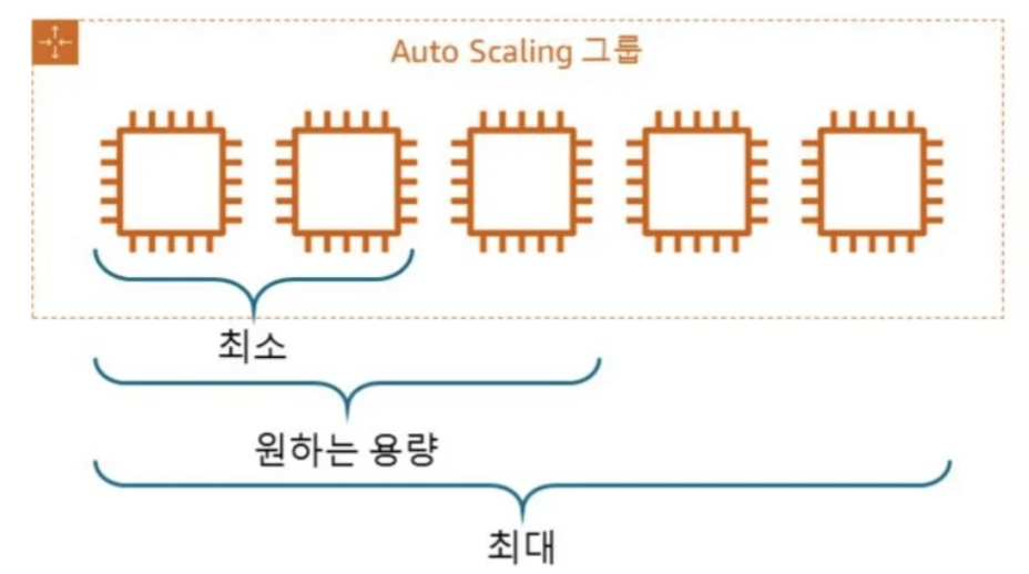 크기 조정 (Auto Scaling) : 수직 크기 조정, 수평크기 조정. Amazon Auto Scaling은 수평 크기 조정을 의미함. Auto Scaling 그룹의 예 (우) : 처음에는 3개 인스턴스로 시작, 트래픽이 작으면 2개로 줄이고, 트래픽이 많으면 5개로 증대.