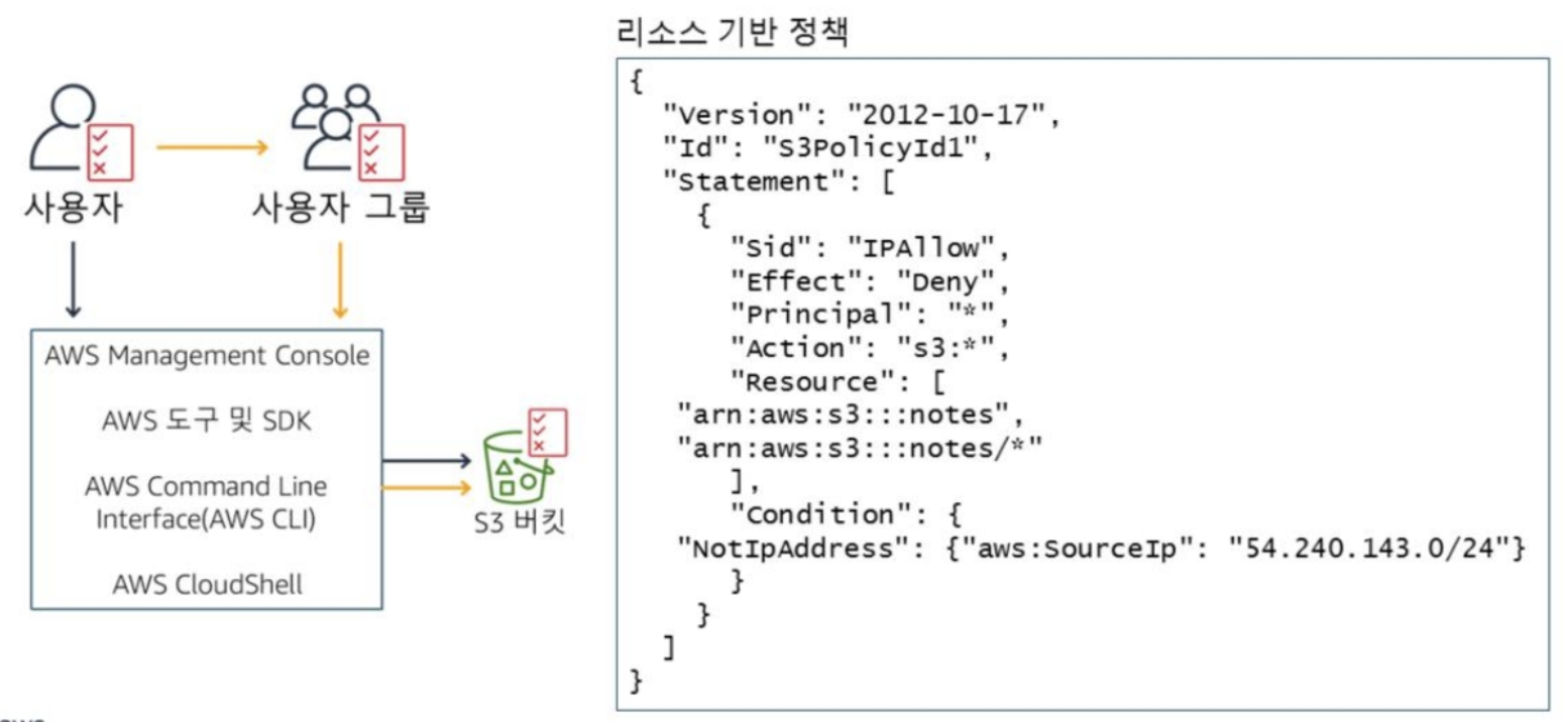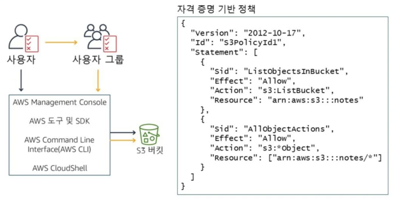 IAM 사용자 혹은 사용자 그룹이 , AWS CLI, Shell, SDK, Console 등을 사용하여 접근 자원에 접근하려 한다. 이 때, 자격증명 기반 정책은 해당 사용자에게 권한을 부여 한다.