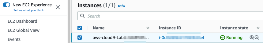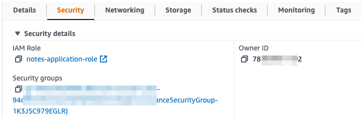 AWS cloud9을 실행 후 좀 더 상세하게 보면, 해당 환경의 EC2 Instance를 살펴 보면 다음과 같이 Cloud9은 Cloud9용 Instance가 이미 구동되어 있다. EC2의 Security 탭에 가보면, IAM Role이 이미 부여되어 있는 것을 알 수 있다. 부여된 Role의 이름은 위에서 사용한 "notes-appolication-role"임을 알 수 있다.