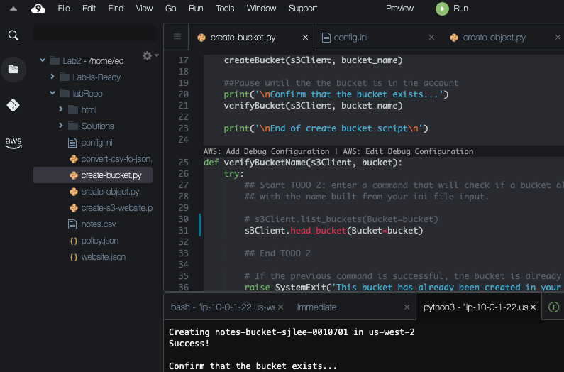 $> aws s3api put-bucket-website --bucket $mybucket --website-configuration file://~/environment/labRepo/website.json