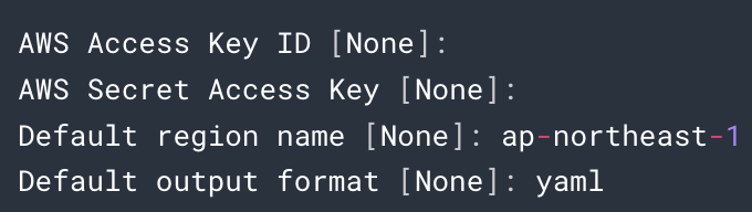 위와 같이 aws cli 명령어를 통하여 기본 설정을 할 수 있다. AWS Access Key ID, Access Key, Region, Format등을 설정해 준다. 별도 Role이 설정 되어 있다면 어차피 개인 증명은 동작하지 않기 때문에, Acces Key ID, Access Key는 그냥 엔터를 치고 넘어가면 된다.