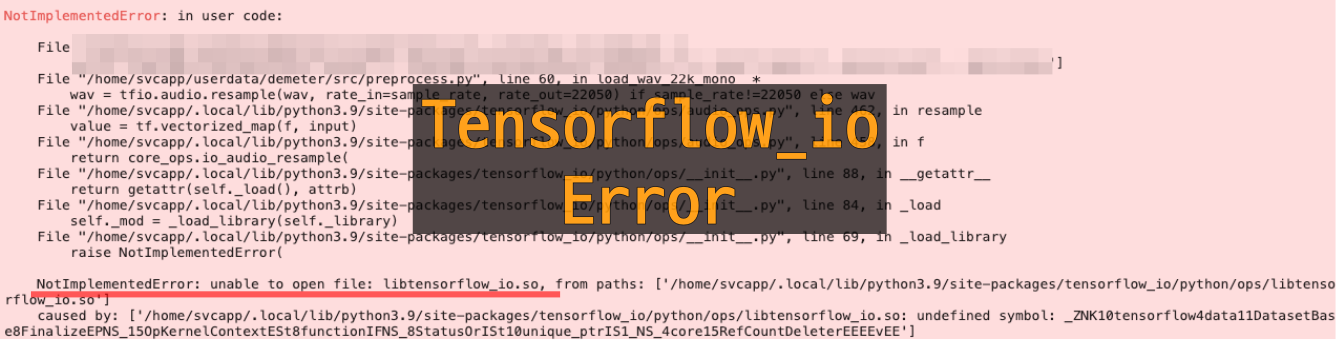 NotImplementedError: unable to open file: libtensorflow_io.so, from paths: ['/home/svcapp/.local/lib/python3.9/site-packages/tensorflow_io/python/ops/libtensorflow_io.so']