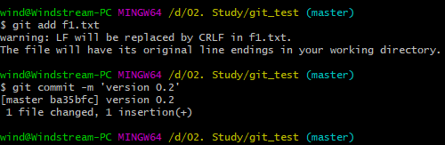 변경된 f1.txt를 version 0.2로 등록하고, 등록(commit) 버전 이력을 확인하였다.