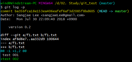 git log 옵션 중에서 -p를 사용하면, 버전의 변경내용을 확인 할 수 있다.