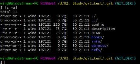 생성된 “.git” 디렉터리 내부에 들어가 보면,