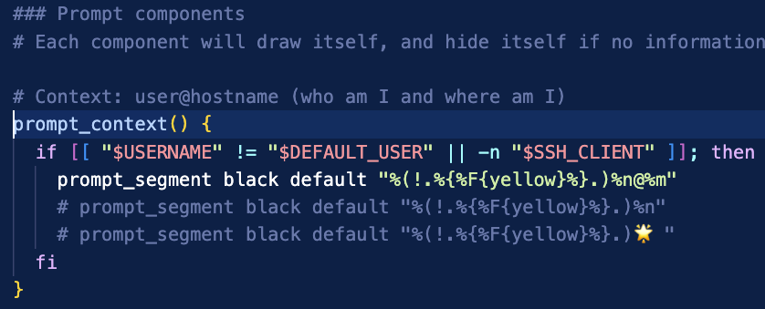 추가적으로, 본인이 사용하지 않는 기능이 있다면, Prompt 구성에서 아예 제외 시켜도 될것 같다. 다음은 앞서 거론한 Prompt 를 조립(build)하는 부분이다. 테마파일을 가장 마지막에 위치해 있다. 이 부분중 본인이 사용하지 않는 기능은 주석 처리하거나, 삭제하면 간편한 커스터마이징이 될것이다. 가령, 가상환경을 사용하지 않는다면, prompt_virtualenv 라인을 주석처리 해도 될것 이다.