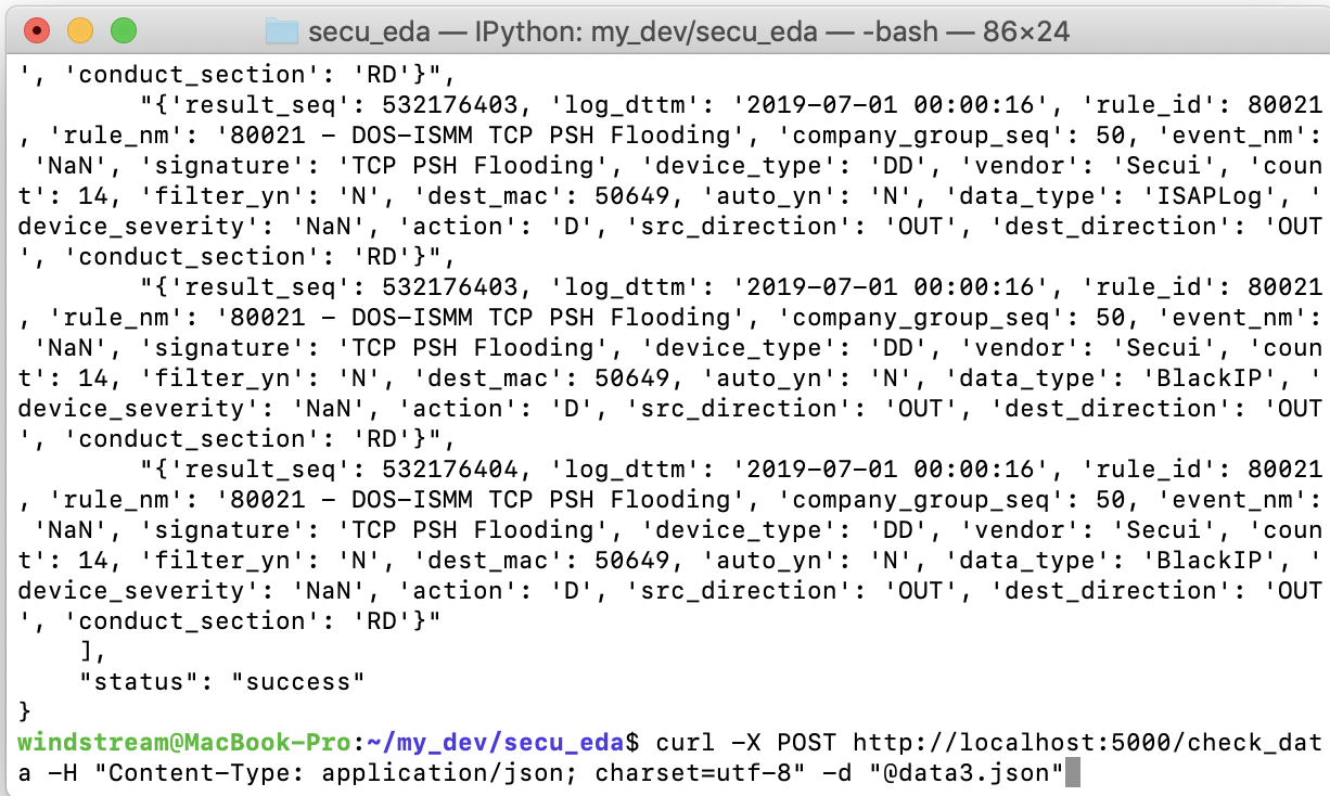 curl -X POST http://localhost:5000/check_data -H "Content-Type: application/json; charset=utf-8" -d ‘{“log_date”:”2019-10-14”, “data” :”dataFrame 1,2,3,4”}’