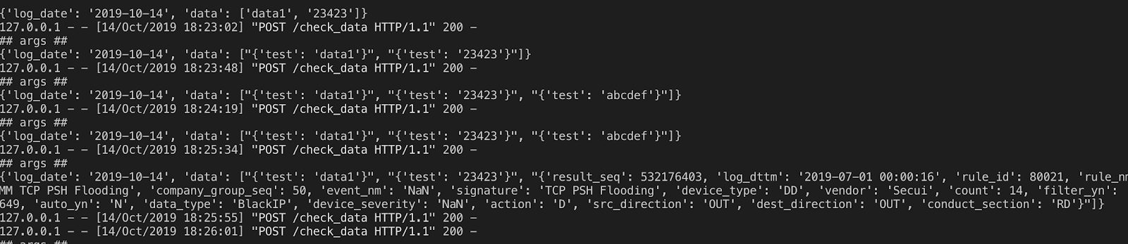 curl -X POST http://localhost:5000/check_data -H "Content-Type: application/json; charset=utf-8" -d ‘{“log_date”:”2019-10-14”, “data” :”dataFrame 1,2,3,4”}’