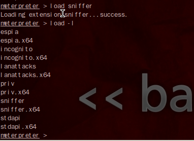 meterpreter에서 추가 모듈 로드 (ex. load sniffer ) 후, 현재 로딩된 모듈 확인 (ex. load -l)