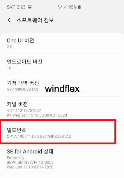 소프트웨어 정보 메뉴 내부에 있는 "빌드 번호" 버튼을 연속으로 눌러 줍니다.