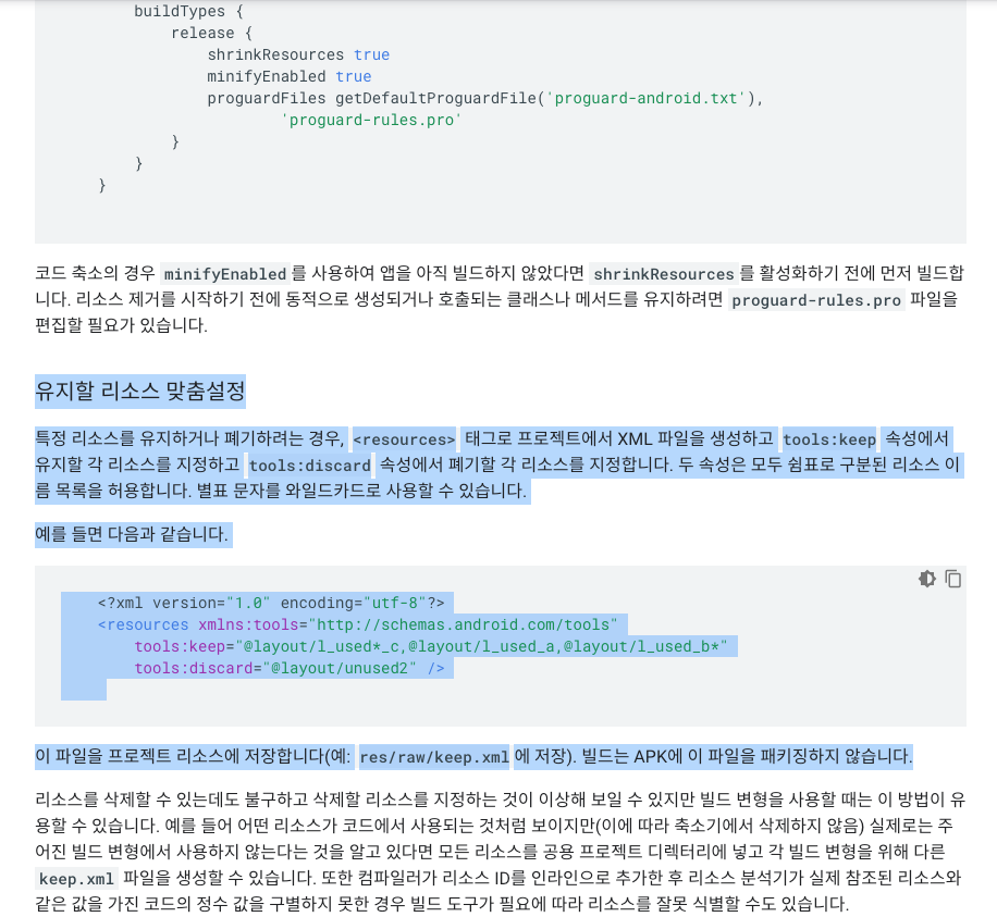 이런 경우 해결 방법으로, proguard가 파일을 제거하지 않도록 xml 파일을 설정해 두면 된다.