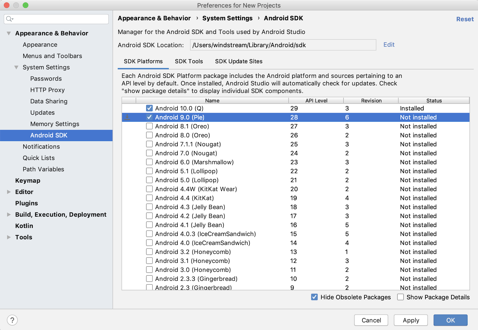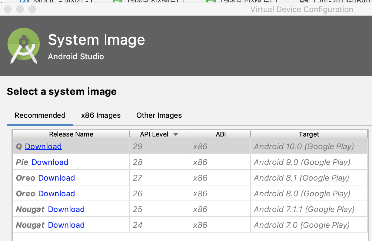 앞서 설치한 SDK에 부합하도록, Pie (Android 9)을 설치해 준다.