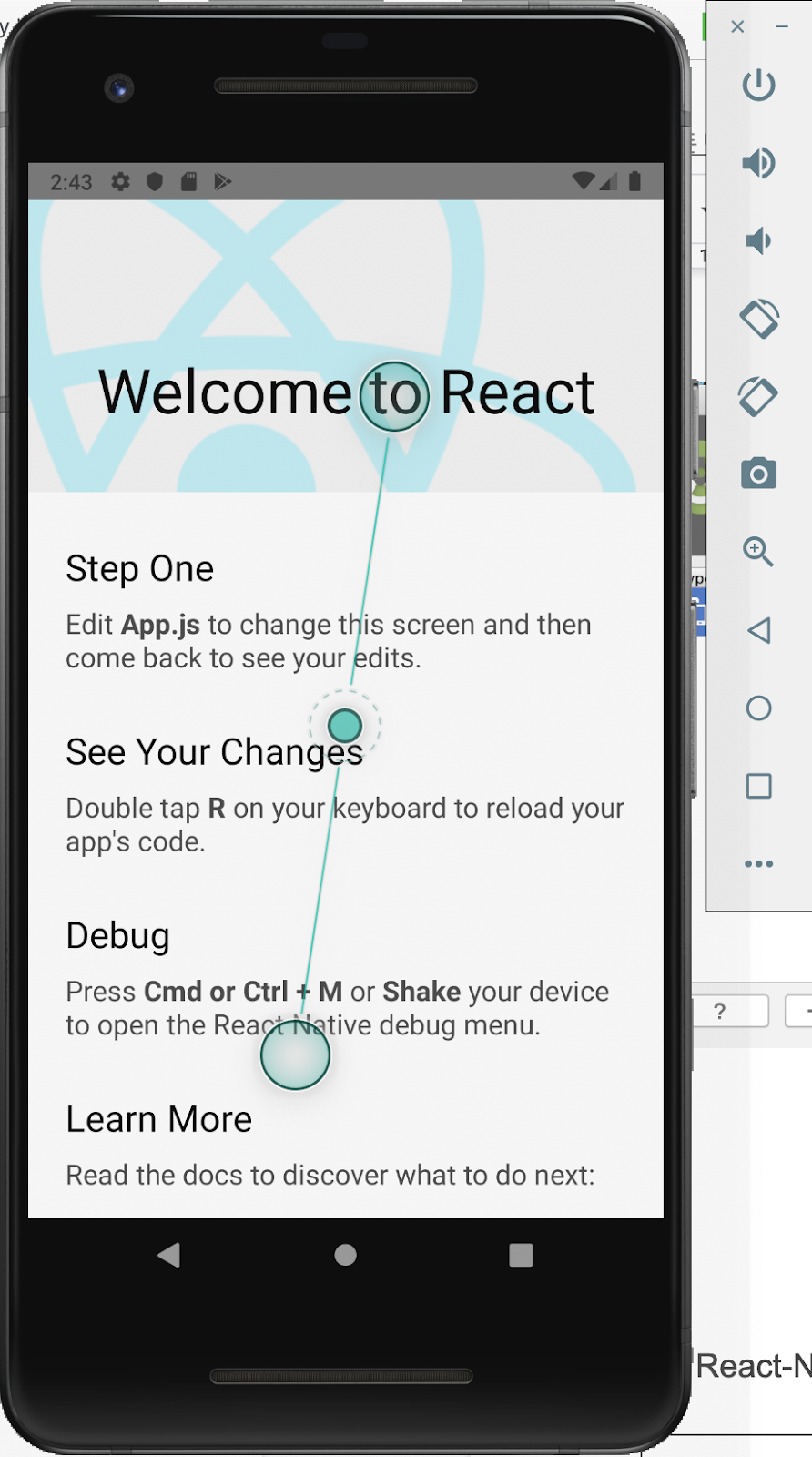 이후, Command Line 에서 ‘ npx react-native run-android ‘ 명령어를 통해서 안드로이드에서 구동하는 앱을 확인할 수 있다.