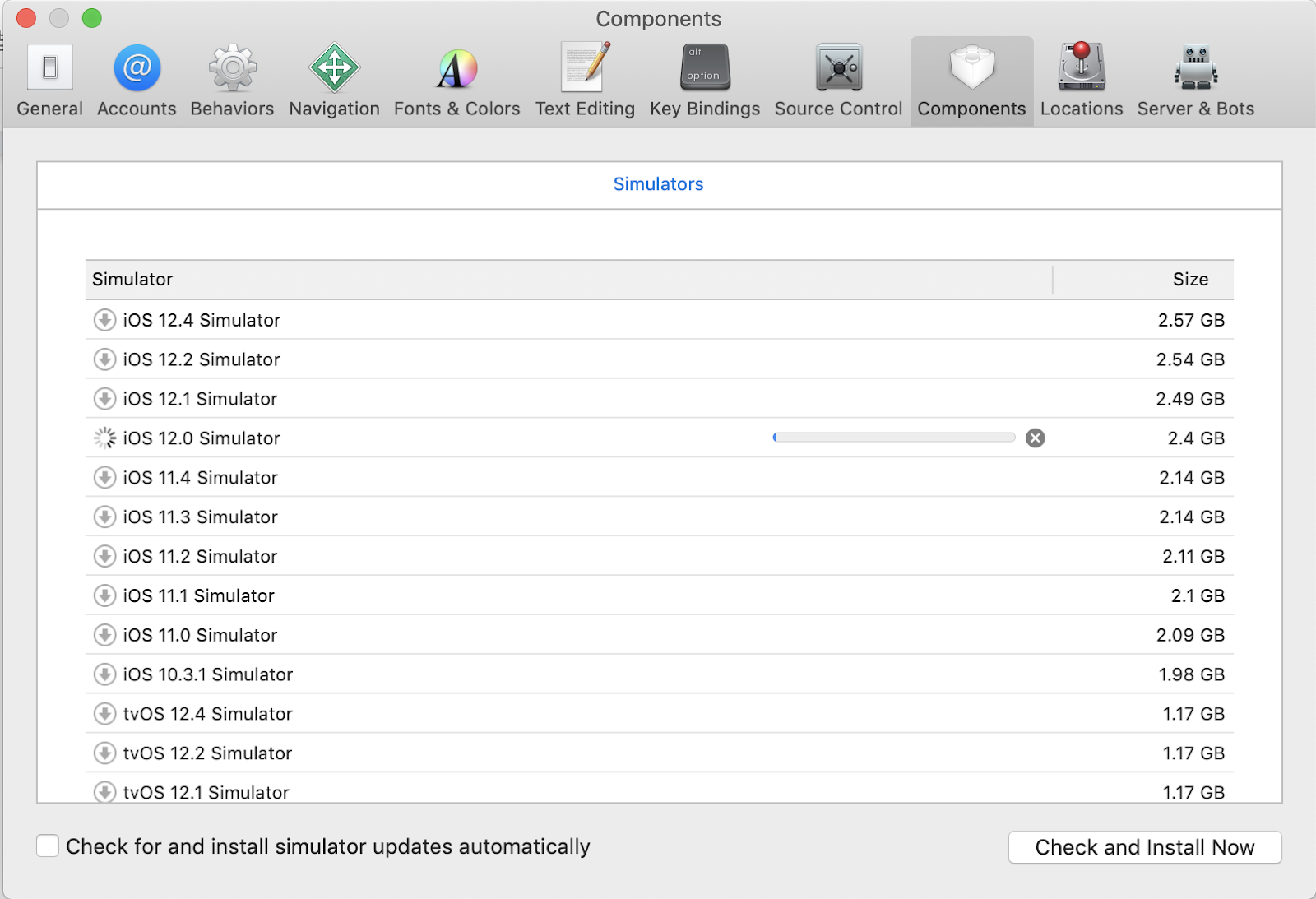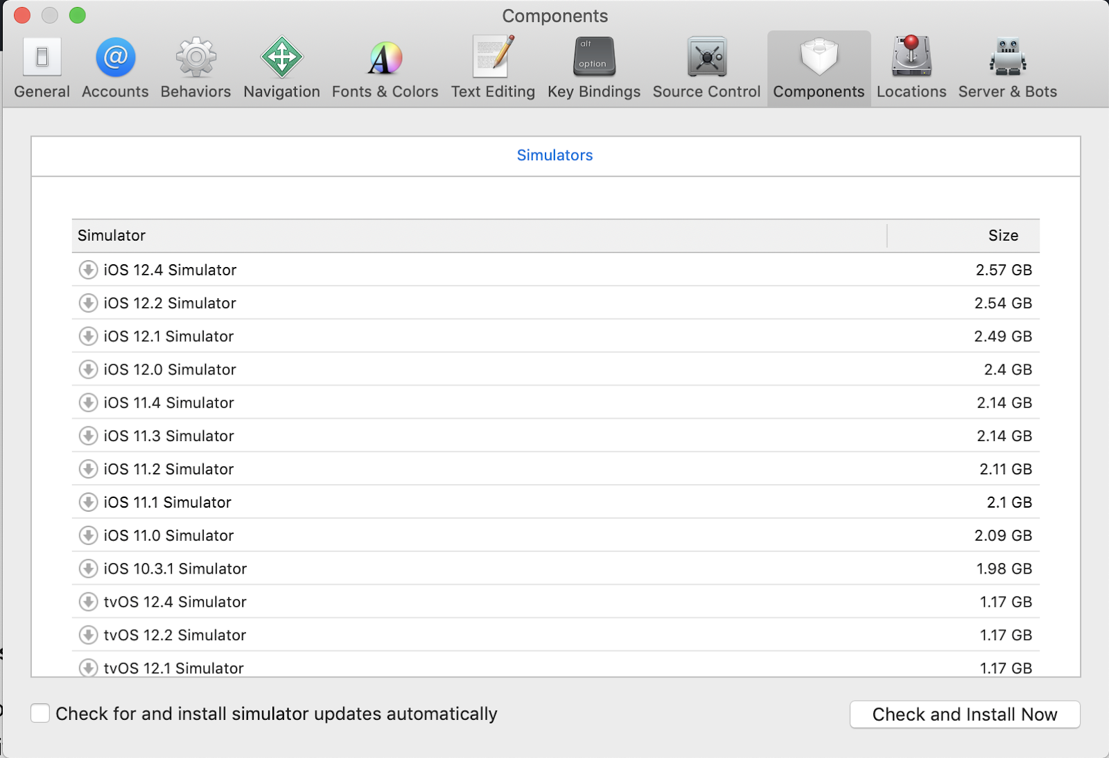 XCode 설치 후, XCode > Preference 에서 Components 탭 에서 시뮬레이션 기종 선택