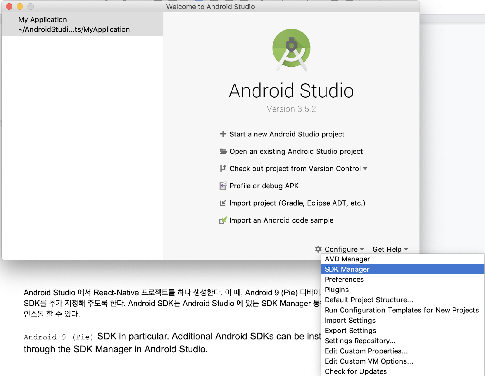 SDK Manager는 Android Studio를 실행하면 나오는 첫 화면의 아래쪽에 Configure > SDK Manager에서 실행 할 수 있다.