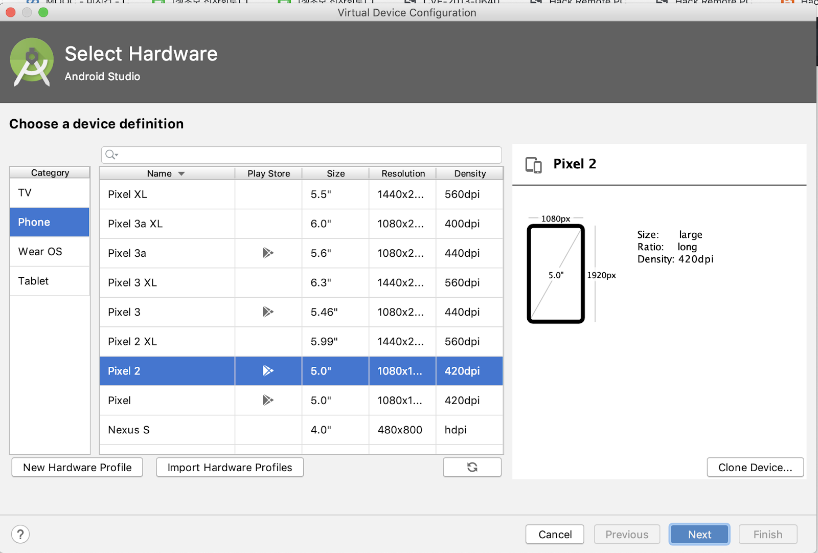 Next를 눌러서, 다음으로 진행하면, Virtual Device가 준비된 상태이다.