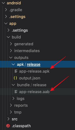 번들링이 실행되고 나면 app-release.aab 번들 파일 (andorid/app/build/outputs/bundle/app-release.aab )이 생성됩니다. 마찬가지로, ./gradlew assembleRelease를 실행하면 app-release.apk ( android/app/buildoutputs/apk/ release/app-release.apk ) 파일이 생성 됩니다.