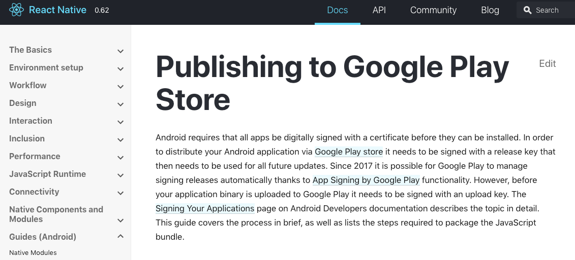 React Native 공식 홈페이지에는 Google Play Store에 출시하기라는 제목으로 설명이 되어 있습니다. 그러나, 우리는 아직 번들링 과정도 거치지 않은 상태이므로, 번들링이 완료 되면 이 글을 읽어 봅시다. 아직은 필요 없겟습니다. 게다가 무려...영어 ^^ 입니다. ㅎㅎ