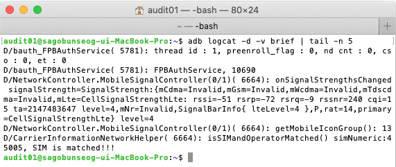 혹은, 스마트폰의 shell 로 접속을 해서, 스마트폰 내부에서 logcat을 실행 해도 동일 합니다.
