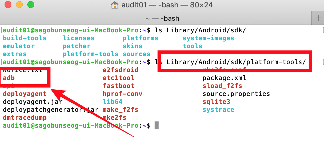 제 경우에는 ~/Library/Android/sdk/platform-tools/ 경로에 adb 명령어가 있는 것을 확인 할 수 있습니다.