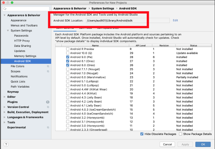 System Settings > Android SDK에서 기본 라이브러리의 경로를 확인합니다.