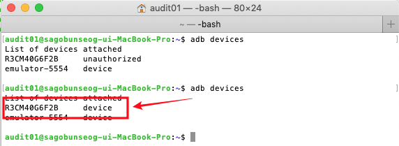 USB 디버깅 허용으로 선택하고, 다시 adb devices 명령을 실행하면,