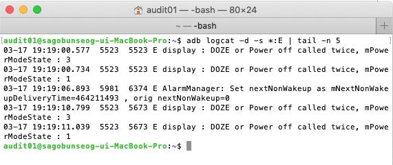 $ adb logcat -d -s *:E | tail -n 5