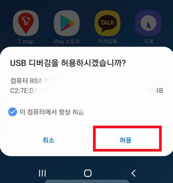 6) USB로 스마트폰 연결 후, USB 디버깅 "허용" 버튼 선택