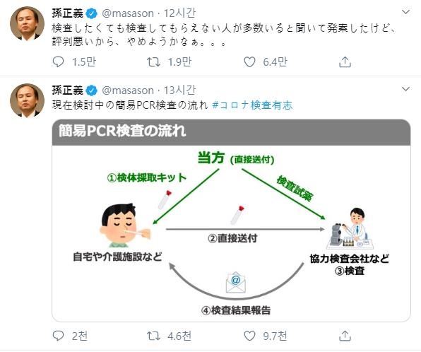 손정의 (소프트뱅크 회장)이 일본내에 코로나 바이러스 (COVID-19) 검사 키트를 무상 제공하겠다고 의사를 밝혔다고 합니다. (3.11일)