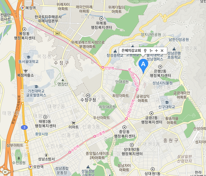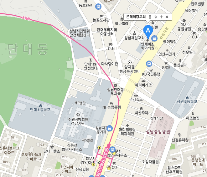 은혜의강 교회가 어디인가 찾아 봤습니다. 성남 단대초 근처와 을지대학교 사이에 있네요.