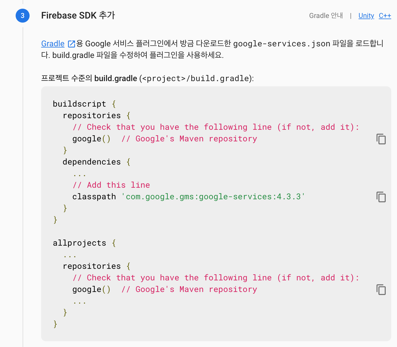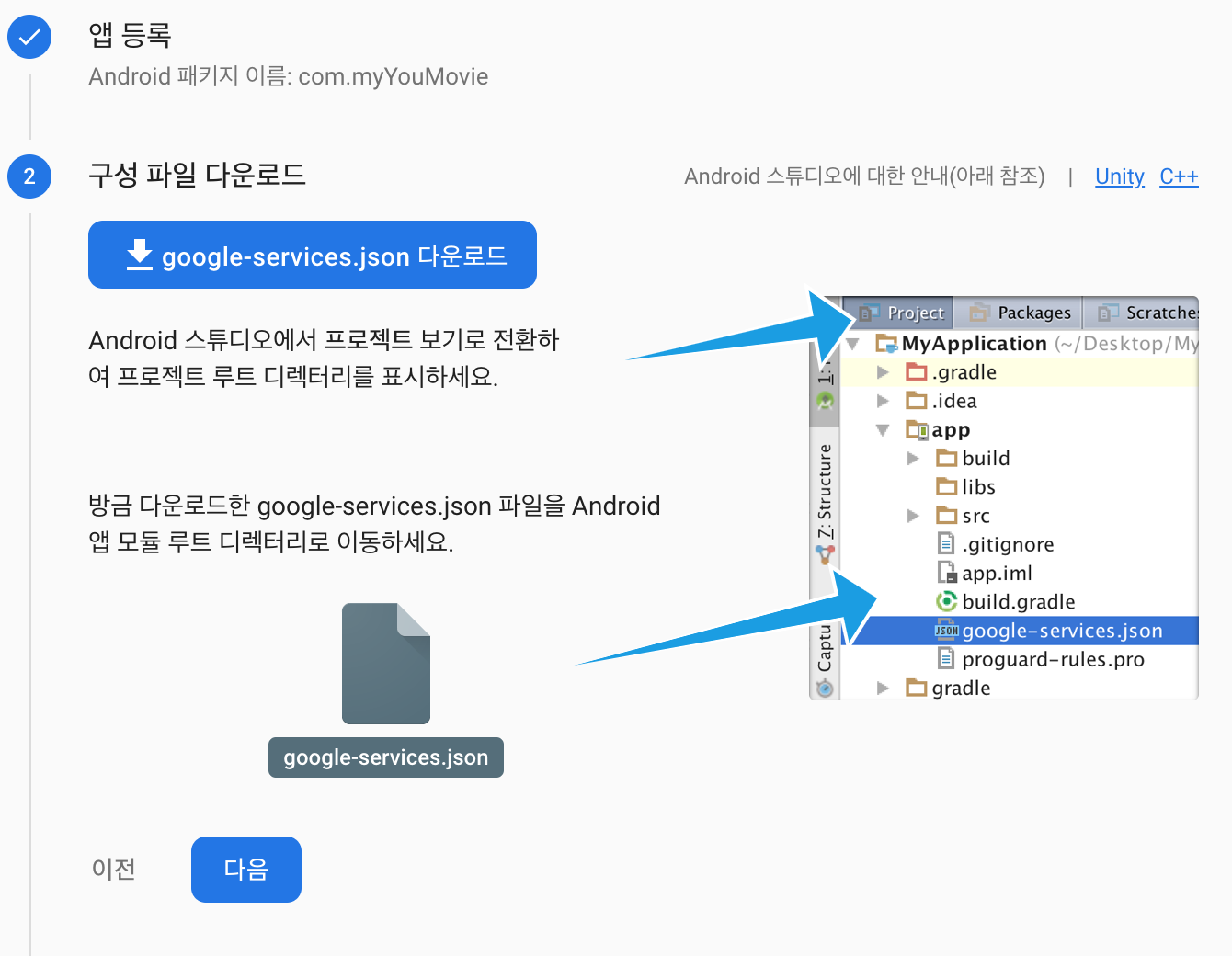 다음 단계에서 사용하는 SDK는 구성 파일(google-services.json)을 읽어들여 설정을 자동화 합니다.