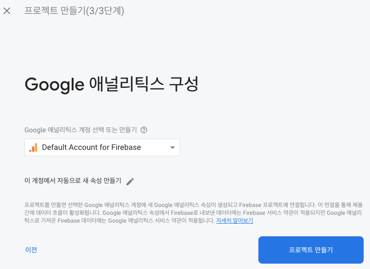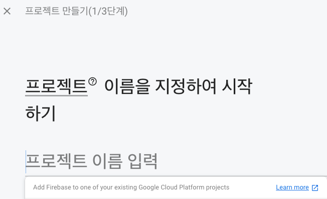 처음 로그인을 하면 아래와 같이 Firebase 프로젝트 추가 화면이 나올 것입니다.