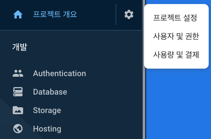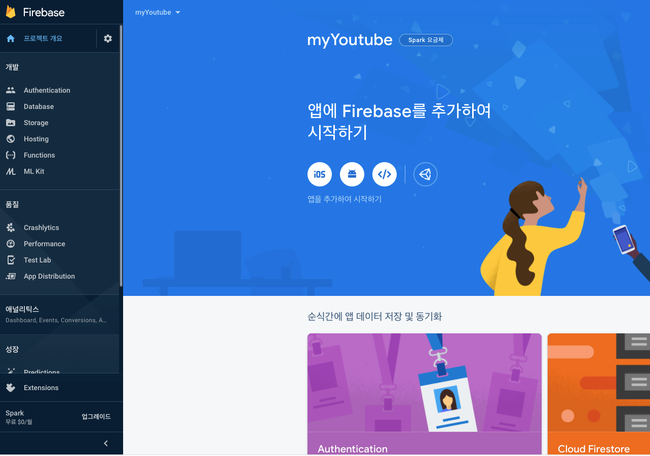 왼족에 나열된 기능들, 아래에 리스팅 되어 있는 Authentication / Cloud firestore 등의 기능을 적용하려면,