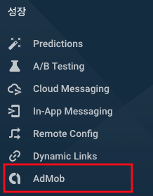 왼쪽에 나열된 기능을 쭉 보다 보면, 성장메뉴에 AdMob도 자리하고 있는 것을 볼 수 있습니다. ^^