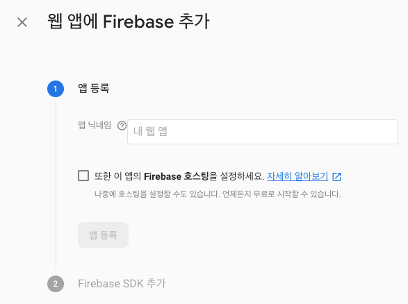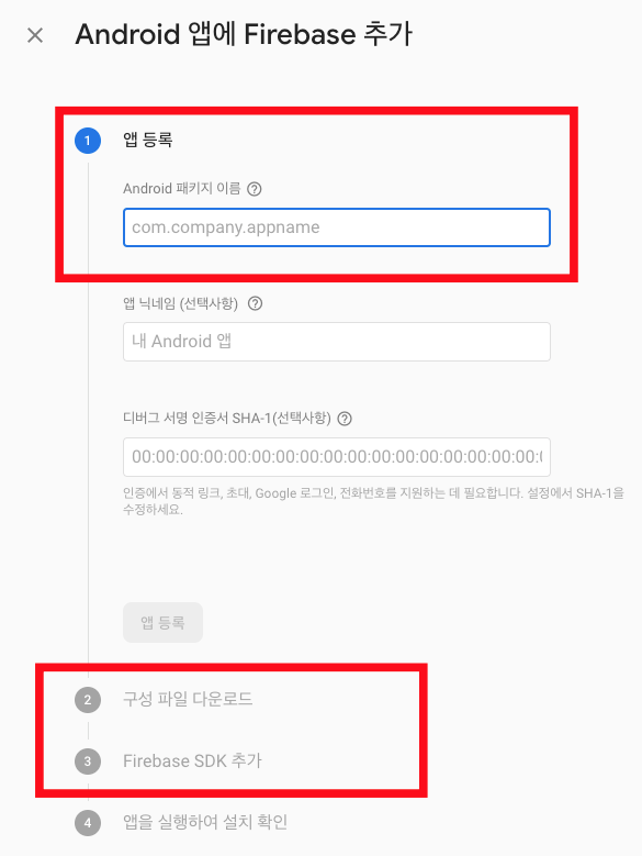 앱에 대한 이름 등록하고, Firebase SDK 를 추가/연동하는 작업으로 이루어 집니다.