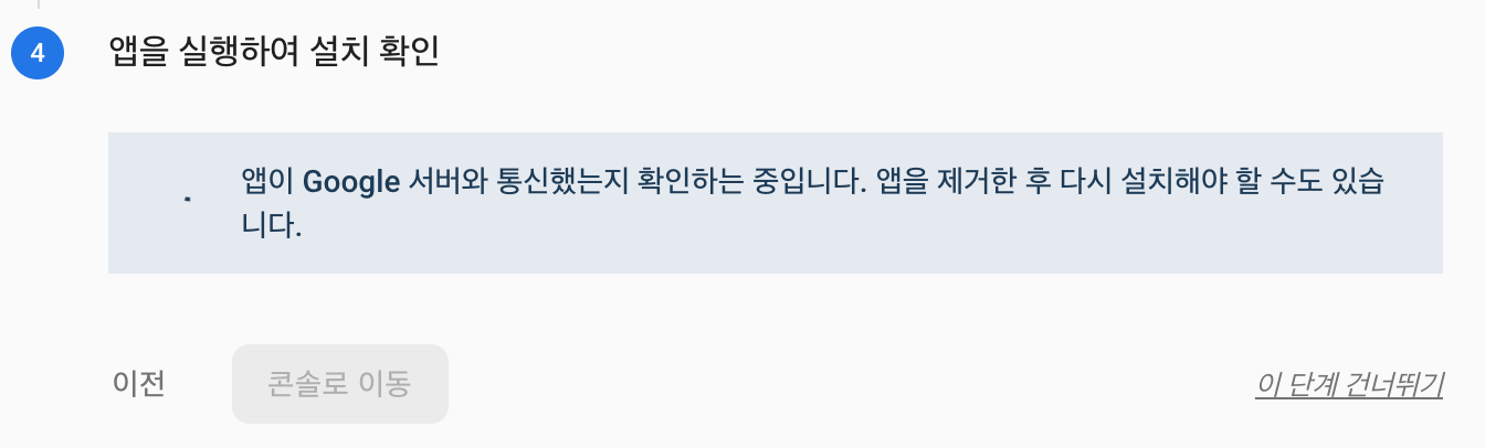 4단계 : 앱 실행하여 설치 확인 단계를 누르면, 위 이미지와 같이, google 서버와 모바일앱이 통신 했는지를 확인 해 줍니다.