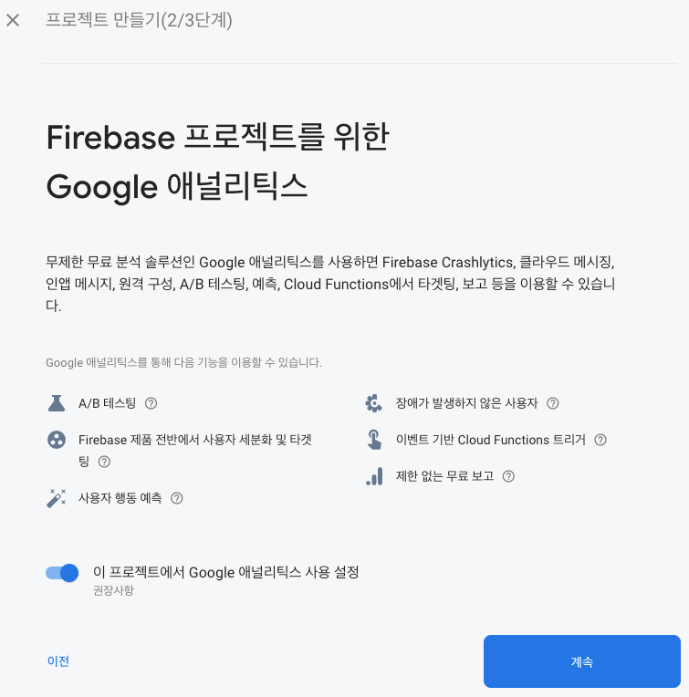 처음 로그인을 하면 아래와 같이 Firebase 프로젝트 추가 화면이 나올 것입니다.