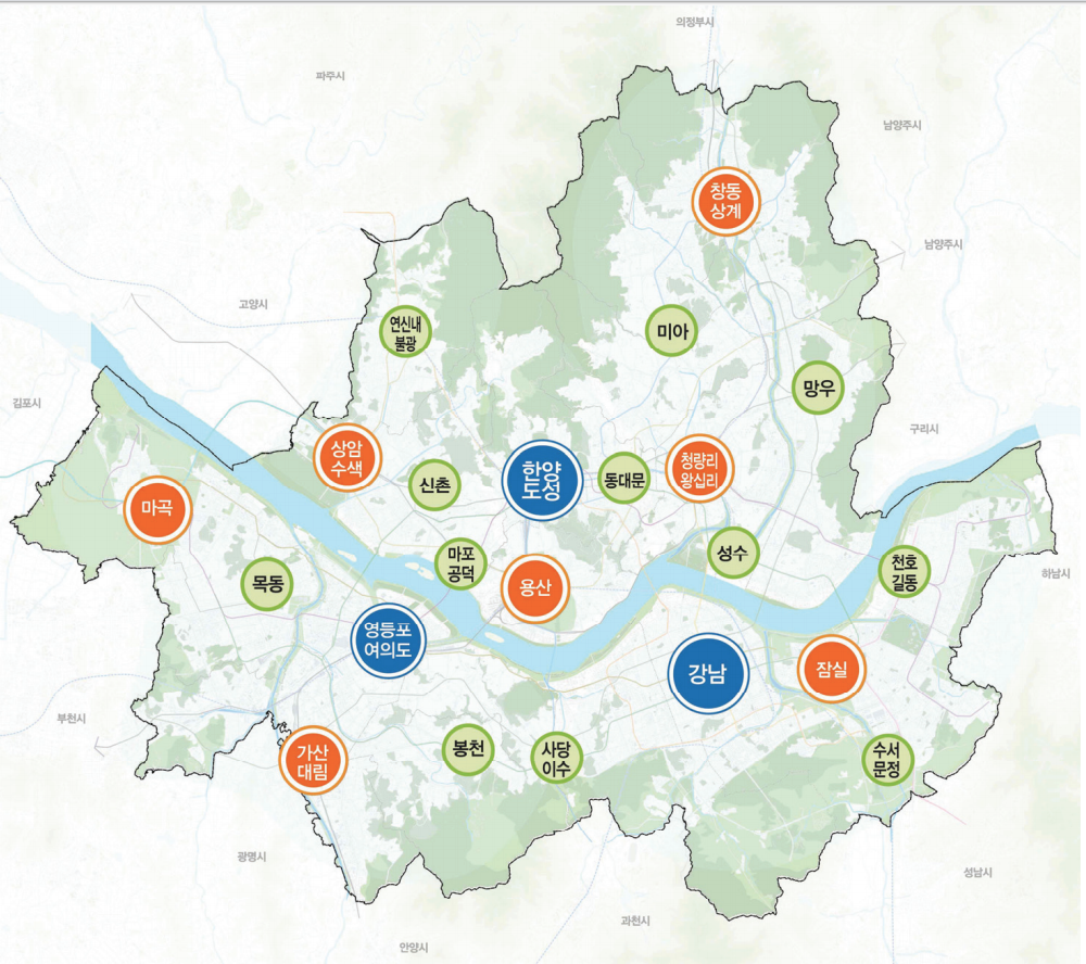 3개 도심은 이미 잘 알고 계실 것이고, 마곡, 가산/대림, 잠실, 용산, 상암/수색, 청량리/왕십리 가 7개 광역 중심으로 그 역할이 상향된 것을 알 수 있습니다. 2020 계획과 2030 계획 상에서 그 위상이 변화하였거나, 없던 지역이 새롭게 등장하는 지역을 유심히 살펴볼 필요가 있습니다.