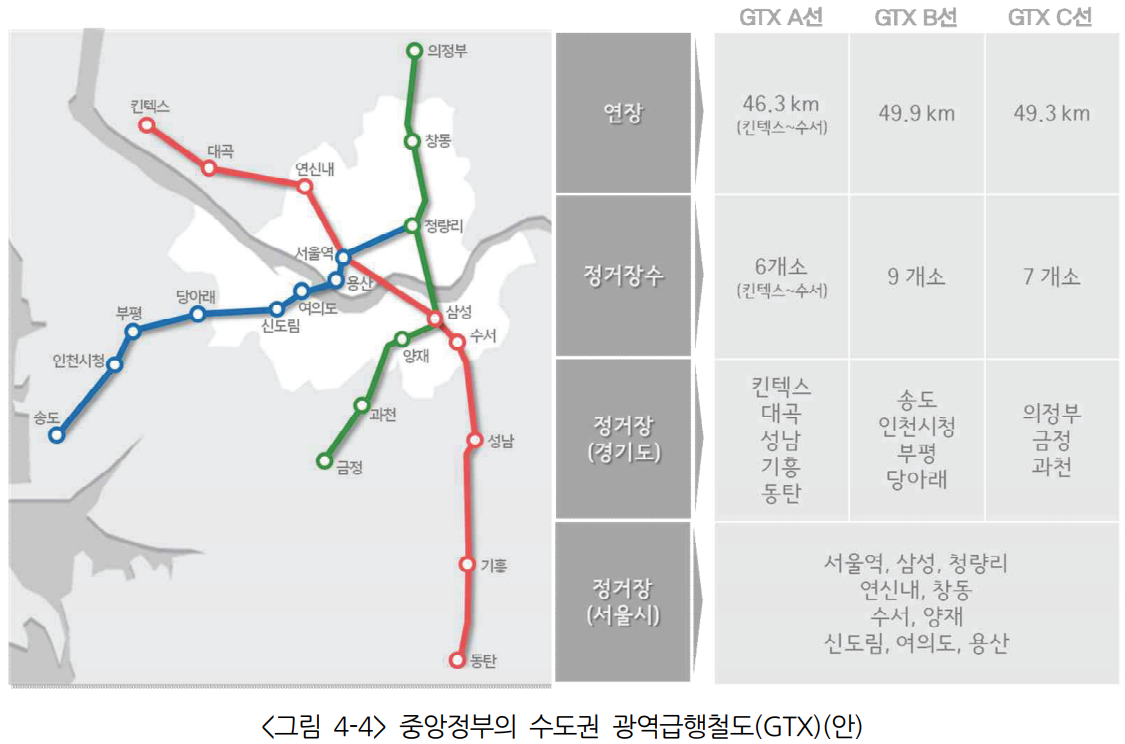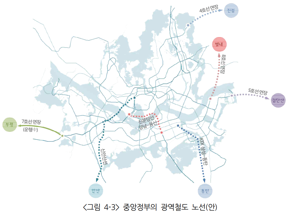2030 서울계획의 3도심 내용과, GTX 철도 내용을 함께 보면, 종로/서울역, 삼성동, 여의도 의 3도심이 축이라는 것이 이해가 갑니다. 모든 철도들이 3도심으로 모이도록 설계를 했습니다. 다음 광역교통축 구상안을 한번 보시죠.