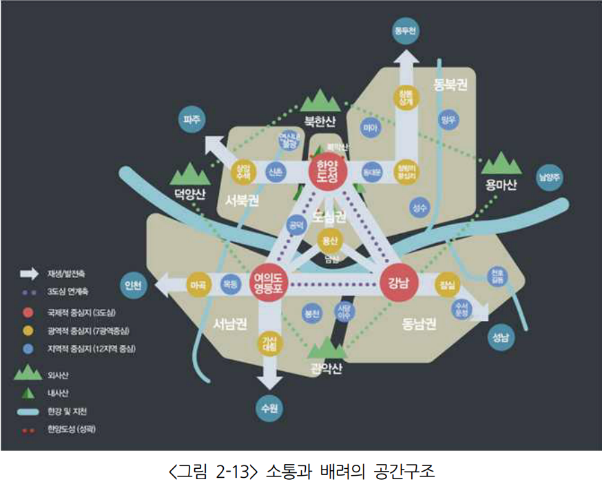 다음은 각 중심과 광역 중심/지역 중심을 잇는 축을 관점으로 도식화 한 그림입니다.
