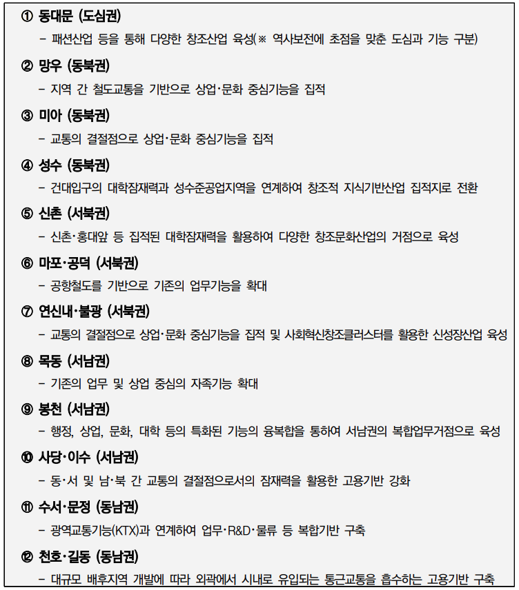 7대 광역중심의 특성 및 육성방향