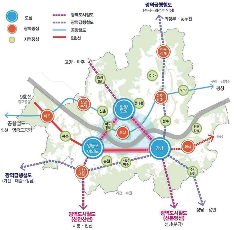 9호선, 공항철도, 신안산선, 신분당선 등이 눈에 들어옵니다. 3도심 외에 마곡, 상암/수색, 청량리/왕십리/ 잠실이 주로 눈에 노출이 되네요.기본 중의 기본이므로 수시로 눈으로, 머리로,,, 마음으로 넣어 두십니다. ^^;;;;
