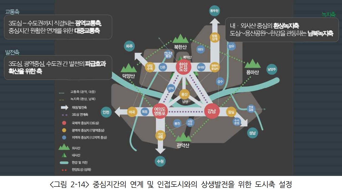 다음은 각 중심과 광역 중심/지역 중심을 잇는 축을 관점으로 도식화 한 그림입니다.